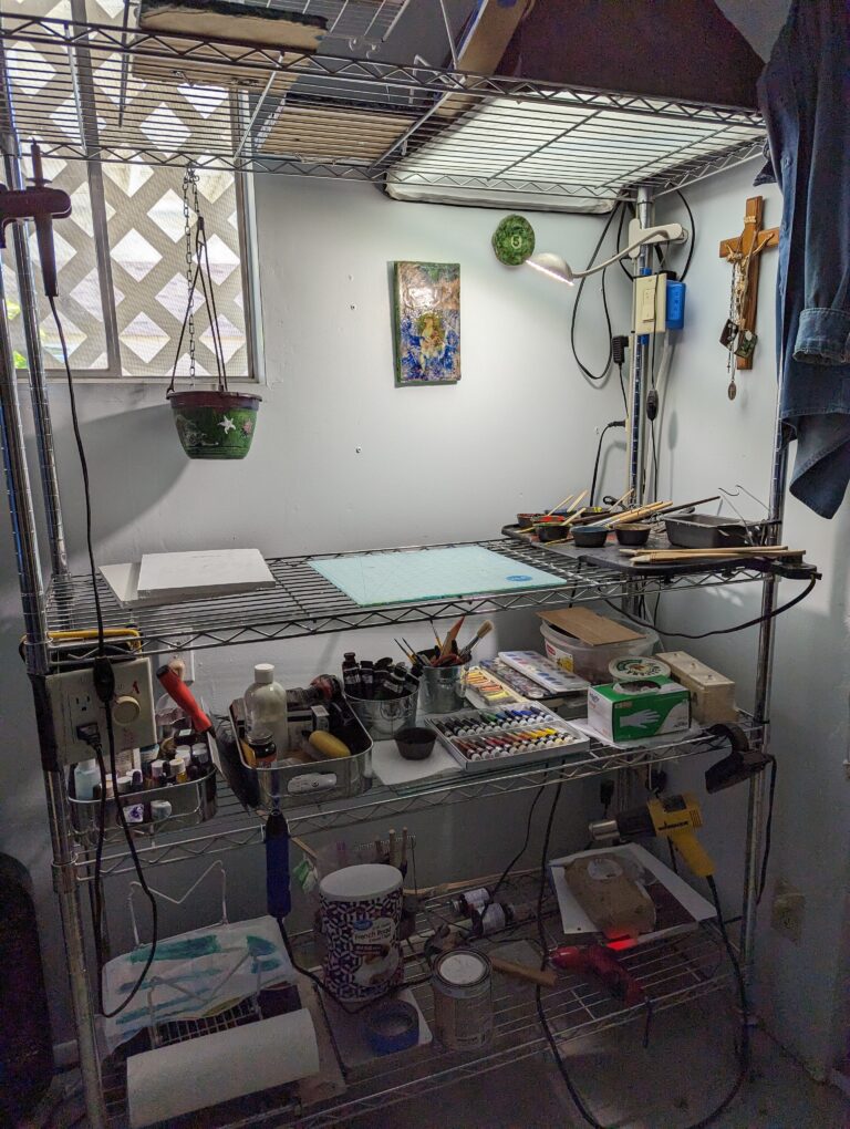 My cart, although small-ish and portable, is in a lost corner of the property right now, waiting for a new location. I’m looking for reliable power (the heat gun combined with the griddle that melts the wax are a strong draw) and proper ventilation.